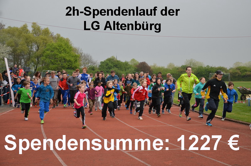 2h-Spendenlauf großer ErfolgDie Laufaktion der LG Altenbürg Karlsdorf-Neuthard zugunsten des "Festivals der guten Taten" am 05. April 2014 fand eine tolle Resonanz. Insgesamt gingen 192 Läufer/innen auf die 400m-Stadionrunde. Alle Altersklassen waren dabei vertreten, jeder lief oder walkte in seinem Tempo soweit ihn die Beine trugen. Besonders erfreulich war, dass neben den Mitgliedern der LG Altenbürg und befreundeten Leichtathletikvereinen auch zahlreiche fleißige Rundensammler aus weitern Abteilungen vertreten waren (u.a. Faustball, Lauftreff, Nordic-Walking, Turnen weiblich sowie Faustballeltern). Auch die Gemeinde war mit einem Team sowie durch Bgm. Sven Weigt vertreten. So konnte ein völlig überraschendes Ergebnis von 1227 Runden erlaufen werden, was einer Strecke von beinahe 500 Kilometern entspricht. Durch den unermüdlichen Einsatz der Läufer wurde eine großartige Gesamtspendensumme von 1227 € erzielt. Ein großes Dankeschön gilt allen Spendern und Sponsoren sowie besonders den Läuferinnen und Läufern die diese Aktion erst mit Leben gefüllt haben!