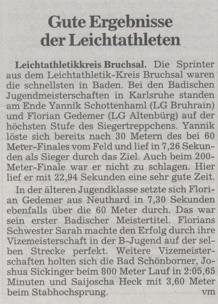 Im Feld der A-Jugendlichen standen mit Florian Gedemer nur insgesamt vier Meldungen im 60m-Sprint zu Buche. Florian nutzte die Gunst der Stunde und erreichte in einem souveränen Lauf seinen ersten Badischen Meistertitel. Dies bedeutete gleichzeitig den ersten Landestitel für die LG seit der Gründung 2004. Damit krönte Florian seine bisher schon sehr erfolgreiche Hallensaison in der er seine Bestzeit deutlich verbesserte und u.a. 25 Deutscher Jugendmeister wurde.