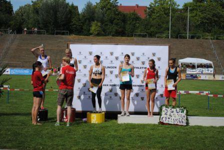 ![]() Sarah Gedmer (2.v.r.) bei der Siegerehrung der 100m.