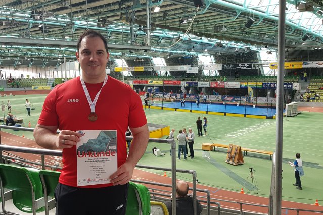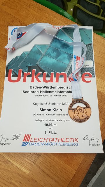 Bronze bei BaWü SeniorenAm 25.01.2020 fanden im Sindelfinger Glaspalast die Baden-Württembergischen Seniorenmeisterschaften der Leichtathleten statt. Mit dabei von der LG Altenbürg Karlsdorf-Neuthard war Simon Klein in der Altersklasse M30. Nach zwei zweiten Plätzen im Vorjahr reichte es diesmal zu Rang drei und der Bronzemedaille. Mit der Weite von 10,93m zeigte er sich nicht ganz zufrieden. Zwar verbesserte sich der Athlet der LG Altenbürg Karlsdorf-Neuthard im Vergleich zur Freiluftmeisterschaft des vergangenen Jahres leicht (10,88m), blieb aber hinter der Vorjahresleistung von 11,12m zurück. Trotz allem kann von einem gelungenen Saisoneinstand gesprochen werden.