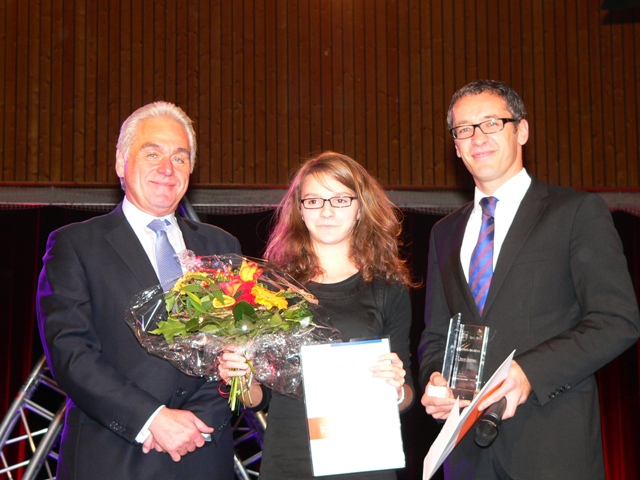V.l.n.r.: Innenminister Heribert Rech, Sportlerin des Jahres Sarah Gedemer, Bürgermeister Sven Weigt