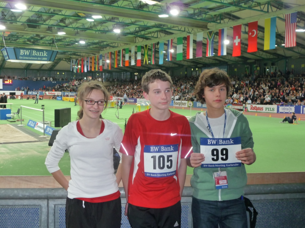 BW Bank MeetingBW Bank Meeting in der Karlsruher Europahalle Leichtathletik der Extraklasse war am Sonntag, den 31.01.2010 in der Karlsruher Europahalle geboten. Das Karlsruher Hallenmeeting das inzwischen zu den beiden weltweit bedeutendsten Leichtathletik Indoor Veranstaltungen zählt, bot in diesem Rahmen auch den regionalen Nachwuchstalenten der Alterklasse Schüler A (Jg95 und Jg96) die Möglichkeit zusammen mit Profis aus 30 Nationen einen unvergesslichen Wettkampf zu bestreiten. Für die LG Altenbürg war dies der zweite Auftritt in der Europahalle innerhalb weniger Tage. Den Auftakt der Veranstaltung gestaltete Sarah Gedemer im Sprint über 60m. In einem eng umkämpften Rennen bestätigte Sarah getragen durch die 4500 Zuschauer ihre gute Form und erzielte in 8,19s einen hervorragenden 2. Platz. Wenig später starteten Noah Hodolic und Lucas Baumgärtner über 1000m. Für Noah war eine Zeit unter 3:20 min und die Qualifikation für die badischen Hallenmeisterschaften das Ziel des Tages. Lucas, der erst wenige Tage zuvor seine Bestzeit auf 3:10 min gesteigert hatte, nahm die 3 Minuten Marke ins Visier. Beflügelt durch die außergewöhnliche Atmosphäre erreichte Lucas mit einer neuen Bestzeit von 3:04,80 min (Platz 4) und Noah in 3:16,21 min (Platz 9) und der Qualifikation in der Tasche das Ziel. Herzlichen Glückwunsch an alle 3 Teilnehmer.
