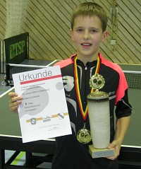 Bei den Baden-Württembergischen Meisterschaften U 13 hat der erst zwölfjährige Richard Breitschopf mit seinem Sieg im Einzelwettbewerb die Farben des TSV mehr als würdig vertreten. Nur die vierundzwanzig Besten waren zu diesem hochklassigen Kräftemessen von ihren jeweiligen Verbänden aufgrund vereinbarter Quoten nominiert. Bereits in den Gruppenspielen ließ der Kraichgauer keinerlei Zweifel daran aufkommen, dass er konsequent auf Sieg gebürstet war. Drei souveräne Siege bescherten ihm nicht nur den Gruppensieg sondern unmittelbar die Qualifikation für das Viertelfinale. Lukas Luchner (FT 1844 Freiburg) ,Kevin Gellhaus (TTC rollcom Reutlingen) und Dennis Kleinbeckes (SV Sillenbuch) fanden kein probates Mittel, um Richards Angriffslust zu bremsen. Befeuert von diesem gelungenen Start setzte er sich im Viertelfinale mit kontrollierten Topspinbällen gegen seinen früheren Trainingspartner und in Bestform aufspielenden Timo Berger (1. TTC Ketsch) mit 14:12, 12:10 und 11:9 durch.