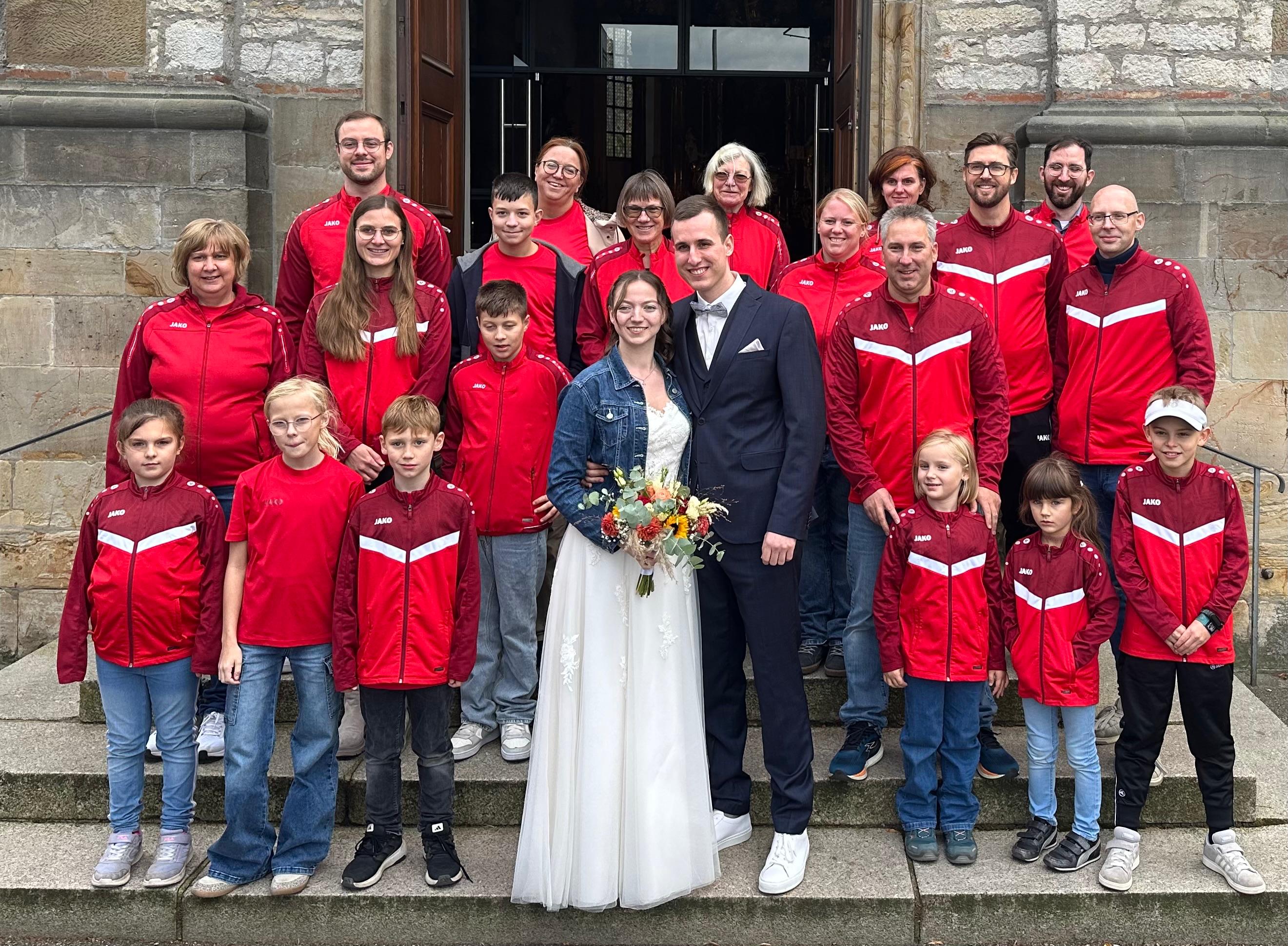 Herzlichen Glückwunsch zur HochzeitDie LG Altenbürg gratuliert ihrem Trainer Tobias und seiner Annalena von ganzem Herzen zur Hochzeit! Am 18. Oktober gaben sich die beiden in Bruchsal das Jawort. Natürlich ließ es sich die LG-Familie nicht nehmen, diesen besonderen Tag mitzugestalten: Einige unserer Trainingskinder und Vertreter des Trainerteams standen Spalier und bereiteten dem Brautpaar einen emotionalen Empfang mit strahlenden Gesichtern. Wie es bei der LG Altenbürg Tradition ist, soll der neue gemeinsame Lebensweg natürlich sportlich gestartet werden - daher waren die beiden aufgefordert, beim aufgebauten Parcours Hütchen zu umlaufen, Hindernisse zu überwinden und drei Bälle in ein Hütchen zu treffen. Wir freuen uns sehr mit euch, dass ihr diese Aufgabe bestens gemeistert habt, und heißen Annalena nun auch offiziell in unserer LG herzlich willkommen. Für euren gemeinsamen Weg wünschen wir euch alles erdenklich Gute, Glück, Gesundheit und viele unvergessliche Momente.