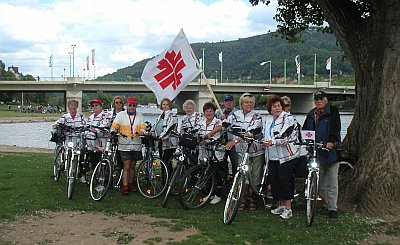 Dies war jedoch noch nicht alles; auch die Dienstagsfrauen hatten es sich nicht nehmen lassen, einer alten Tradition gemäß am Badischen Landesturnfest teilzunehmen. Abt.-Leiterin Helgard Robb hatte eine Gruppe von neun Frauen dazu animiert, zusammen mit ihr an der vom Bad. Turnerbund ausgeschriebenen Radsternfahrt zum Landesturnfest teil zu nehmen. Als männlichen Schutz und "Unterwegs-Mechaniker" hatten die Frauen mit Heinrich Riffel, Douglas Robb und dem Ehrenvorstand Peter Krieger eine angemessene Begleitung angeheuert, welche die Rad fahrenden Damen wohlbehütet und sicher durch den Förster Wald (Sandlacher Richtweg) über Rot, Walldorf, Sandhausen und Kirchheim auf das Neckarvorland in Heidelberg und auch wieder zurück brachten - insgesamt rund 85 km, und das an einem Tag. Nur schade, daß das Programm in Heidelberg zu wünschen übrig ließ. Aber ein schöner und unvergeßlicher Tag war es trotzdem. Und eingekehrt wurde natürlich auch noch.