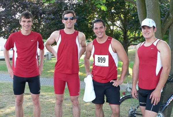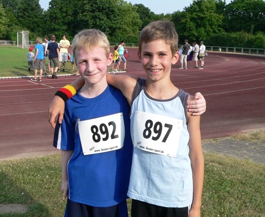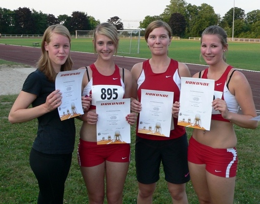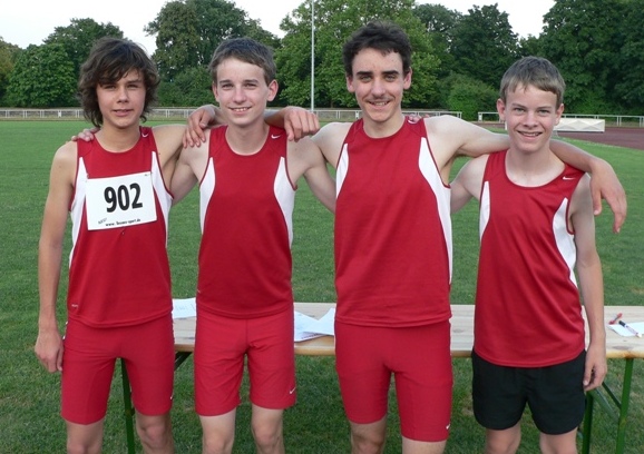 MittelstreckenErfolgreiche Staffeln bei Mittelstreckenmeisterschaften in Bruchsal Während andere bei über 30°C im Freibad oder am See den schönen Sommertag genossen, machten sich einige wagemutige Athleten der LG am 30.06. auf nach Bruchsal ins TSG-Stadion um an den Kreismittelstreckenmeisterschaften teilzunehmen. Und die Bemühungen haben sich gelohnt: Von achtzehn gestarteten Läuferinnen und Läufern fanden sich vierzehn auf dem Siegertreppchen wieder. Zwar reichte es nicht zu einem Einzelerfolg, dafür konnten sich aber gleich zwei Staffeln einen Kreismeistertitel sichern. Über die Olympische Distanz (400-200-200-800) waren sowohl die männliche Jugend B um Jonas Hofheinz, Marius Riffel, Noah Hodolic und Lucas Baumgärtner erfolgreich, als auch Chiara Kneis, Carolin Berghöfer, Jacqueline Heneka und Anna Lamsfuß welche eine Staffel in der weiblichen A-Jugend bildeten. Fabian Groß (M10) und Tobias Baumgärtner (M13) erreichten in ihren 1000m-Läufen jeweils den dritten Platz. Dieses Kunststück gelang auch der olympischen Männerstaffel, welche von Florian Gedemer, Stefan Hoffmann sowie Benedikt und Simon Klein gebildet wurde. In 4:06,5min verbesserten sie sogar den alten LG-Rekord um 14 Sekunden. Die guten Ergebnisse komplettierten Lukas Schmitt, welcher im 19er-Feld der Neunjährigen einen tollen vierten Platz belegte, sowie Tobias Just, Rebecca Hodolic und Markus Just. Schön dass trotz der Hitze eine so erfolgreiche Truppe zusammengekommen ist! Die Ergebnisse im Überblick: 1. KM Olymp. Staffel mJB: Jonas Hofheinz, Marius Riffel, Noah Hodolic, Lucas Baumgärtner 1. KM Olymp. Staffel wJA: Chiara Kneis, Carolin Berghöfer, Jacqueline Heneka, Anna Lamsfuß 3. Kreismeister 1000m M10 Fabian Groß 3. Kreismeister 1000m M13 Tobias Baumgärtner 3. KM Olymp. Staffel Männer: Florian Gedemer, Benedikt Klein, Simon Klein, Stefan Hoffmann 4. Kreismeister 600m M9 Lukas Schmitt 6. Kreismeister 1000m M11 Tobias Just 9. Kreismeister 800m W12 Rebecca Hodolic 11. Kreismeister 600m M9 Markus Just Bilder aus dem TSG Stadion zu Bruchsal: Markus Just und Lukas Schmitt (beide M9). Die olympische Männerstaffel vor dem Start: Florian Gedemer, Stefan Hoffman, Simon Klein, Benedikt Klein (v.l.) B-Jugend Staffel um Lucas Baumgärtner, Jonas Hofheinz, Noah Hodolic und Marius Riffel Anna Lamsfuß, Carolin Berghöfer, Jacqueline Heneka und Chiara Kneis gewannen die A-Jugendkonkurrenz. | |