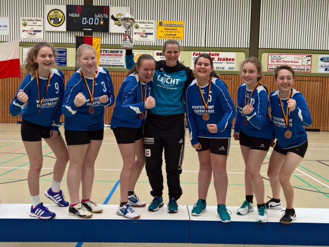 Als westdeutscher Meister hatten unsere Mädels wiederum souverän die Qualifikation für die Deutschen Meisterschaften erreicht, die letztes Wochenende im hohen Norden in Düdenbüttel bei Stade stattfanden. Ohne große Erwartungen traten wir als krasser Außenseiter die weite Fahrt an, denn die letzten Jahre gab es gegen die traditionell starken Großvereine aus dem Norden nichts für uns zu erben. Im ersten Spiel gegen Schülp lagen wir noch schwachem Start schon 6:9 zurück, dann aber ging ein Ruck durch die Mannschaft, endlich konnten wir unsere Nervosität ablegen und erkämpften uns den Satz in der Verlängerung mit 15:13. Auch im zweiten Durchgang konnten wir an diese Leistung anknüpfen und uns nach einem 11:7 das Match letztendlich mit 2:0 Sätzen sichern. In der zweiten Begegnung gegen den letztjährigen Meister vom TV Brettorf sahen dann die Zuschauer wiederum eine ganz starke Leistung unserer Truppe, die nach einem hin und her wogenden Spiel beide Sätze knapp mit 12:10 und 11:9 gewinnen konnte. Weiter ging es gegen den späteren deutschen Meister vom TV Jahn Schneverdingen, gegen den wir den ersten Satz unglücklich mit 9:11 verloren geben mussten. Im zweiten Durchgang wurden wir dann mit 3:11 förmlich überrollt und wussten somit vor dem letzten Spiel, dass gegen den SV Görlitz zumindest noch ein Satz gewonnen werden musste, um als Gruppenzweiter in die Finalrunde einzuziehen. Daran ließen die Girlies denn auch gar keinen Zweifel aufkommen und gewannen den ersten Satz sicher mit 11:7. Danach wurden die Stammkräfte geschont, doch auch die Reservisten zeigten, was sie draufhaben, obgleich der Satz mit 8:11 knapp abgegeben werden musste. Somit standen wir am Sonntag früh im Viertelfinale dem Gastgeber aus Düdenbüttel gegenüber. Deren Trainer hatte eine ganze Liste mit unseren Schwachstellen vorbereitet, die seine Angreiferinnen nach und nach abarbeiteten; allerdings ohne Erfolg. Alle unsere Mädels brachten zu 100% ihre Leistung und rangen die spielstarken Düdenbüttler mit 11:7 und 11:6 grandios nieder. Im Halbfinale trafen wir dann auf die Schwaben vom TSV Gärtringen, gegen die wir schnell in Rückstand gerieten. Wieder kämpfte sich das Team mit toller Moral zurück ins Match, musste den Satz in der Verlängerung aber mit 10:12 abgeben. Auch im zweiten Durchgang konnten wir bis zum 6:6 mithalten, dann ließen die Kräfte etwas nach und auch dieser Satz ging mit 7:11 an die Schwaben. Für uns aber kein Grund zur Traurigkeit, unser Ziel war jetzt der Podestplatz, den wir wiederum gegen den SV Görlitz erkämpfen wollten. Wieder fanden wir nur schlecht ins Spiel und mussten einem Rückstand hinterher laufen, konnten den ersten Satz dann aber in der Verlängerung mit 13:11 gewinnen. Somit war denn auch der Widerstand beim Gegner gebrochen und nach einem 11:6 im zweiten Satz kannte der Jubel bei den Spielerinnen, Trainern und Fans keine Grenzen mehr. In der Abwehr brachten Annika Imhof und Alisha Huber die gegnerischen Angreiferinnen zur Verzweiflung, während im Angriff Nadine Noe mit ihren Schlägen immer wieder punkten konnte. Auf der zweiten Vorderposition zeigten wechselweise Celine Speier und Lea Russel keine Schwächen und erfreuten das Trainerteam mit einer bärenstarken Leistung. Überall auf dem Spielfeld war wieder mal Franziska Habitzreither zu finden, die auf der zentralen Mittelposition fehlerlos alles abwehrte, was in Ihre Nähe kam und darüber hinaus mit ihren Angaben und Schlägen den Gegner vor unlösbare Aufgaben stellte. Letztendlich war es aber der gute Zusammenhalt der Mädels untereinander, der zum Erfolg führte: die Chemie stimmte einfach, alle hatten Spaß und somit konnte jede Spielerin ihre Topleistung abrufen.